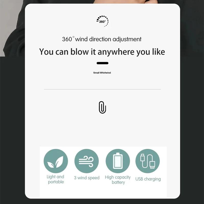 Suitable for blowing air onto the face from within 0.5 meters or blowing air onto the back when clipped onto the waist.